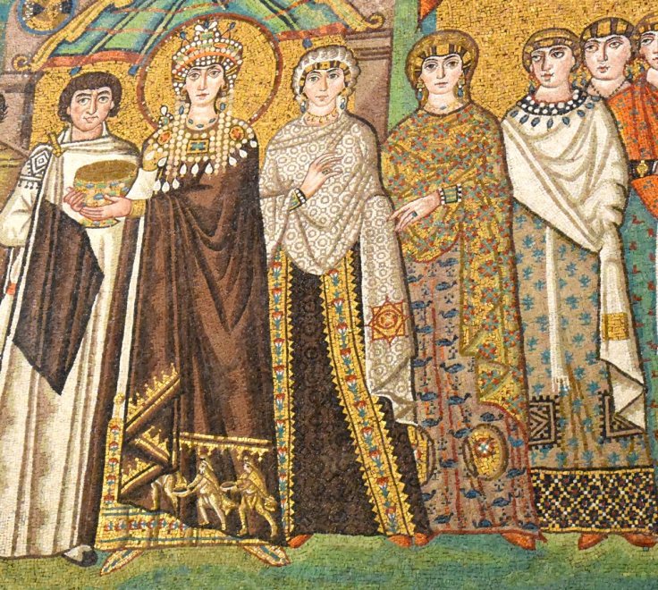 Dans la basilique, une autre grande mosaïque lui fait face : la représentation de Théodora, épouse de Justinien, et de sa suite. On dirait des peintures, tellement les visages, les parures, les tissus sont rendus avec une incroyable finesse comme on peut le voir sur ce détail du panneau :