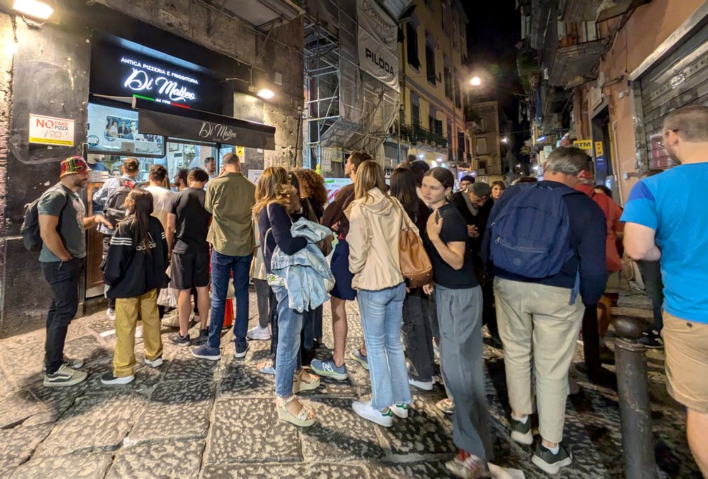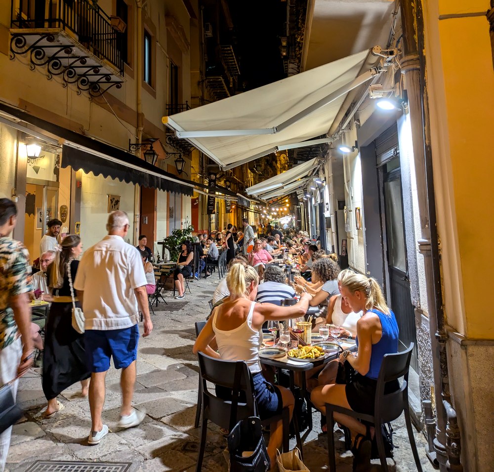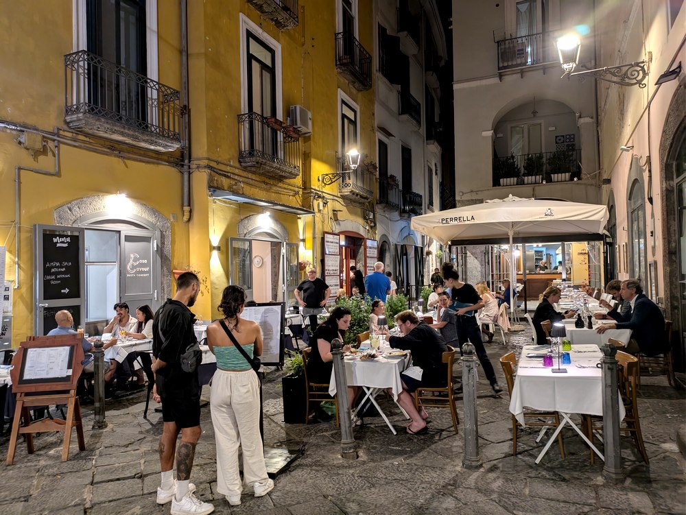 Quel plaisir, le soir venu, de s’immerger dans les rues, ruelles et places des villes italiennes qui bruissent de monde ! Attablés sur une terrasse ou faisant la queue devant leur pizzeria préférée, les Italiens (et tous les autres, bien sûr) profitent de la douceur du soir et du spectacle permanent dans la rue. Ces photos ont été prises à la mi-septembre à Palerme, Salerne et Naples.