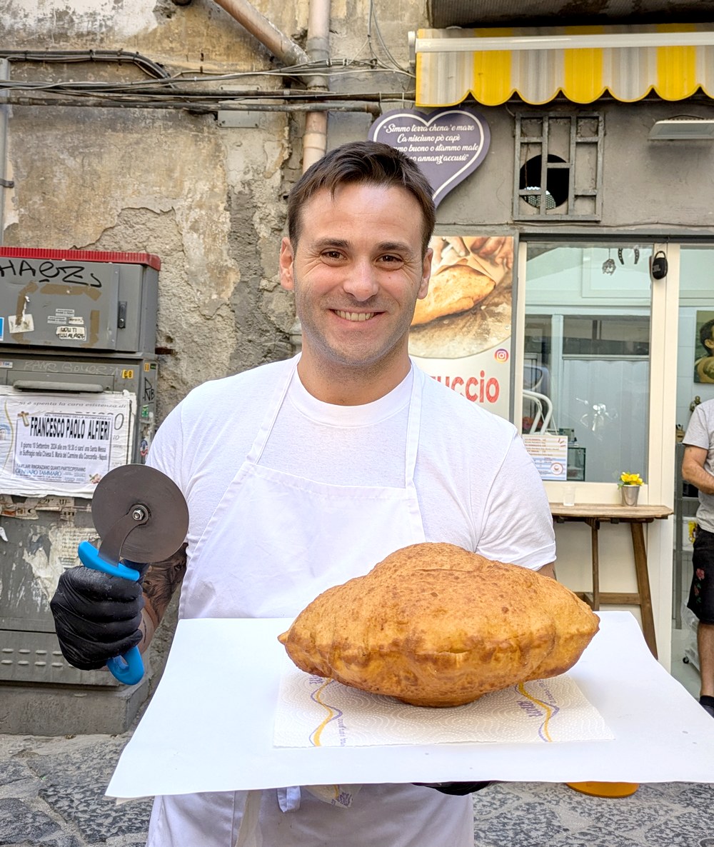 Pour en revenir à la pizza, à Naples j’ai découvert la pizza fritta, ou pizza frite. Au cœur d’un des quartiers populaires de Naples, installés sur une minuscule terrasse – deux tables bancales – nous avons commandé une pizza fritta sans trop savoir ce que c’était… et nous avons vu arriver une pizza repliée sur elle-même, gonflée comme un ballon !