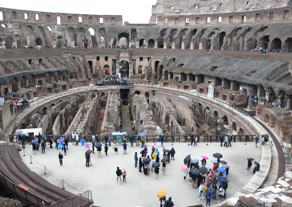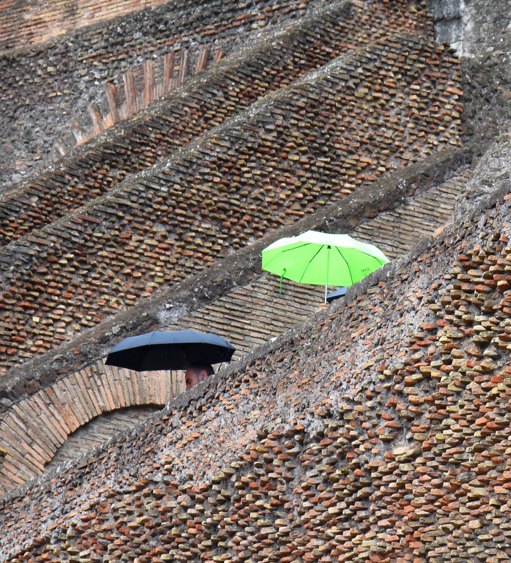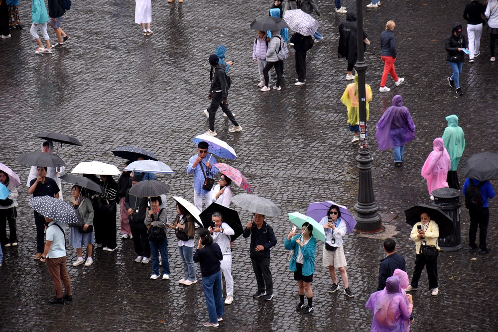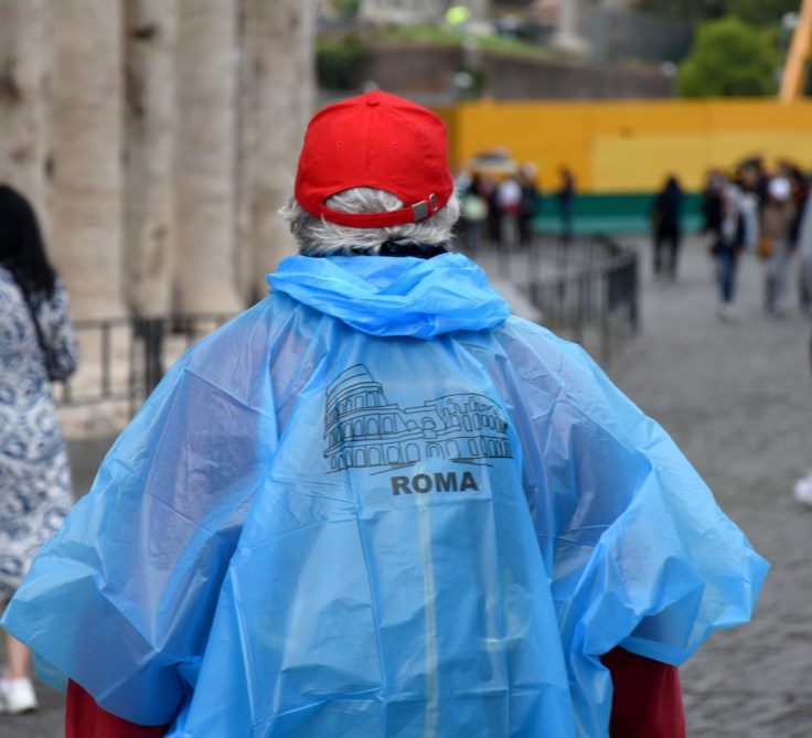 Il pleut ? Pas de problème ! Comme par miracle, les vendeurs de rue, très nombreux autour des sites touristiques, font apparaître immédiatement des parapluies, casquettes et ponchos de pluie. Lors de mon voyage d’un mois en Italie, en septembre 2024, j’ai eu beau temps presque en permanence… sauf à Rome. Achat obligatoire donc d’un poncho, bien pratique, avant de visiter le Colisée sous un ciel plombé. Les seules taches de couleur provenaient des ponchos, k-ways et autres parapluies !